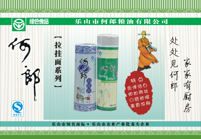 樂山市何郎糧油有限公司是四川樂山國家農(nóng)業(yè)科技園核心區(qū)的大型糧油食品企業(yè),是農(nóng)業(yè)產(chǎn)業(yè)化省級重點(diǎn)龍頭企業(yè)。 公司現(xiàn)具有年加工面粉10萬噸,掛面8萬噸的生產(chǎn)能力。“何郎”牌系列掛面全部采用優(yōu)質(zhì)小麥粉,不添加任何色素、增白劑,無鹽、無堿,無任何有礙健康的添加劑,現(xiàn)加工生產(chǎn)的“何郎”牌銀絲面、雞蛋面等14個(gè)產(chǎn)品已通過綠色食品認(rèn)證并獲得綠色食品認(rèn)證標(biāo)志,“何郎”清涼、滋補(bǔ)、果蔬、營養(yǎng)、保健、寶貝等50種掛面產(chǎn)品被評為“全省無公害產(chǎn)品”、“質(zhì)量信得過食品”和“放心面”,暢銷內(nèi)地的二十多個(gè)省市和遠(yuǎn)銷沿海的深圳、海口、香港等市場,深受消費(fèi)者的喜愛,是信譽(yù)度高、群眾滿意、消費(fèi)者放心的面食品。 銷售熱錢:董經(jīng)理 13990660899 座機(jī)熱線:08333713568