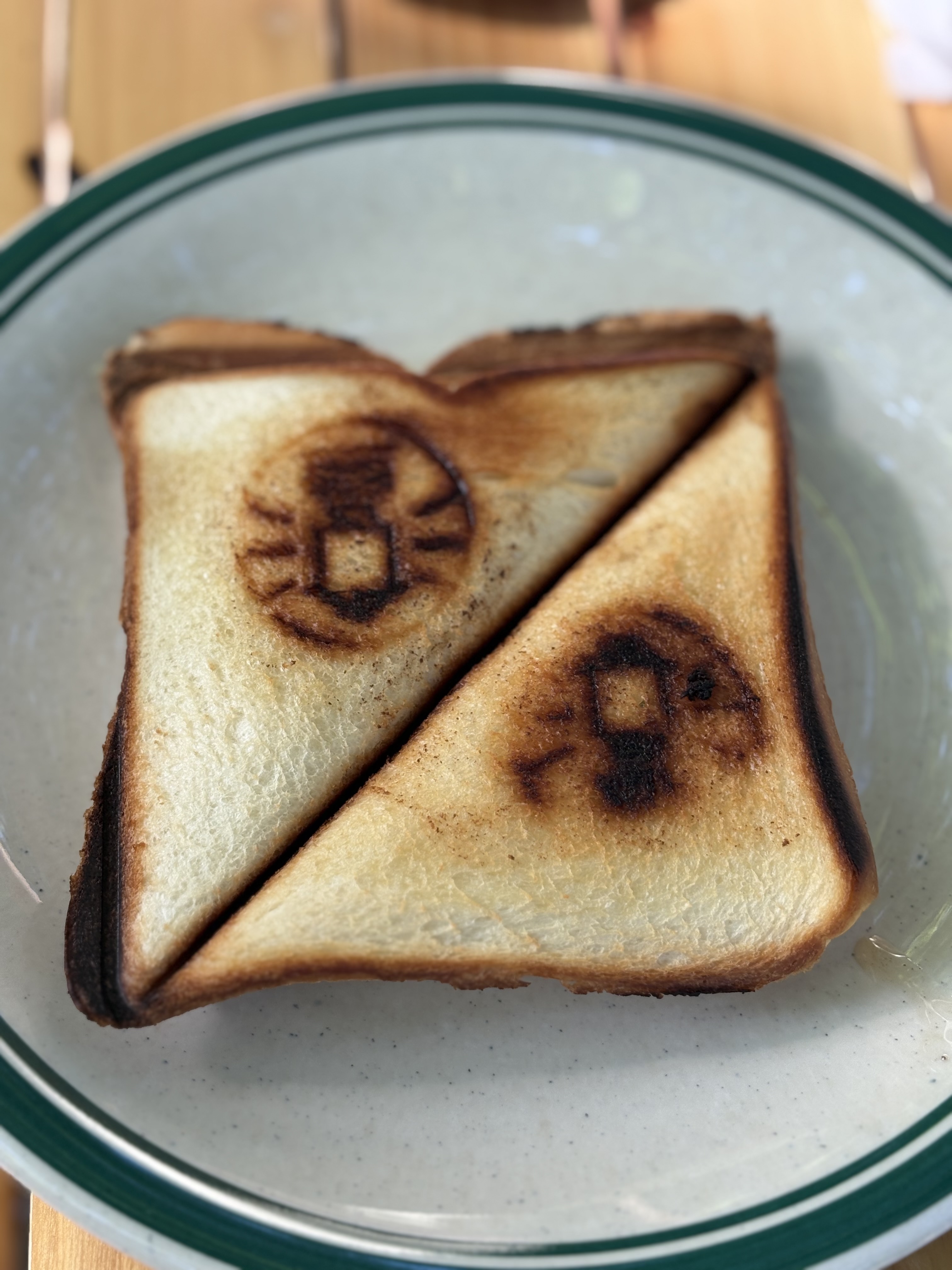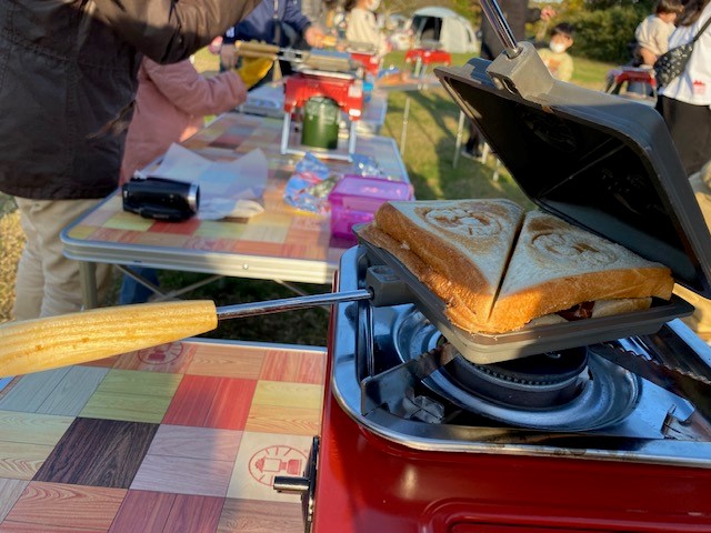 我が家のキャンプ朝食はこれで作ったホットサンド一択!こんがり焼き上がったランタンマークがカワイイ&キャンプ飯の雰囲気を盛り上げてくれます。